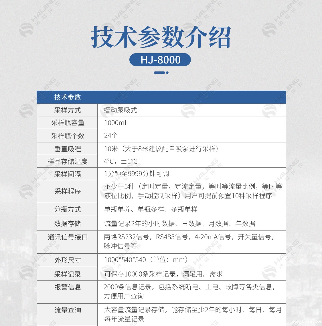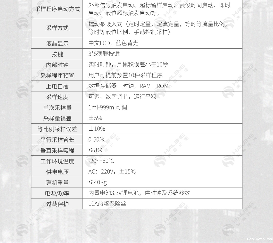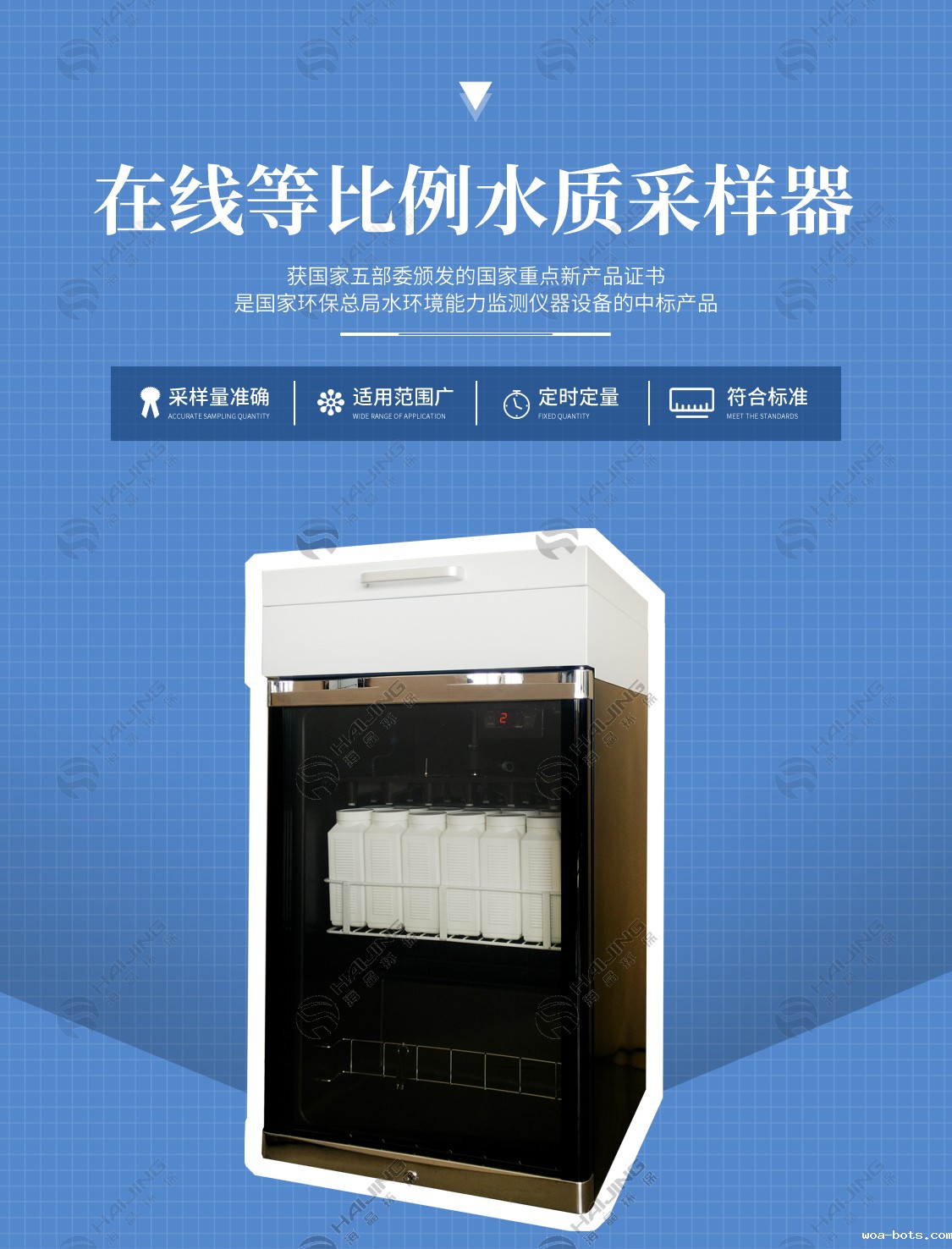 水质自动采样器技术要求及检测方法(HJ/T372-2007),是集流量测量和水样采集一体化的多功能监测仪器,具有体积小,重量轻,便于携带等特点,获国家五部委颁发的国家重点新产品证书,是国家环保总局水环境能力监测仪器设备的中标产品。适用于各级环境监测站、污水处理厂、水利、水务及科研院所,对工业污染源排放口、江、河、湖、海等水样进行自动采样。该仪器是依据国家环境监测技术规范要求,结合我国环境污染状况及各级环境监测部门的需求开发的,是一种可实现按时间、体积比例、定流比例等方式完成采集污水样品的智能采样器,该采样器设计精良、功能强大,能根据用户的需求完成各种采样任务,并具备流量计功能,是或者污物排放日均浓度的必备仪器。