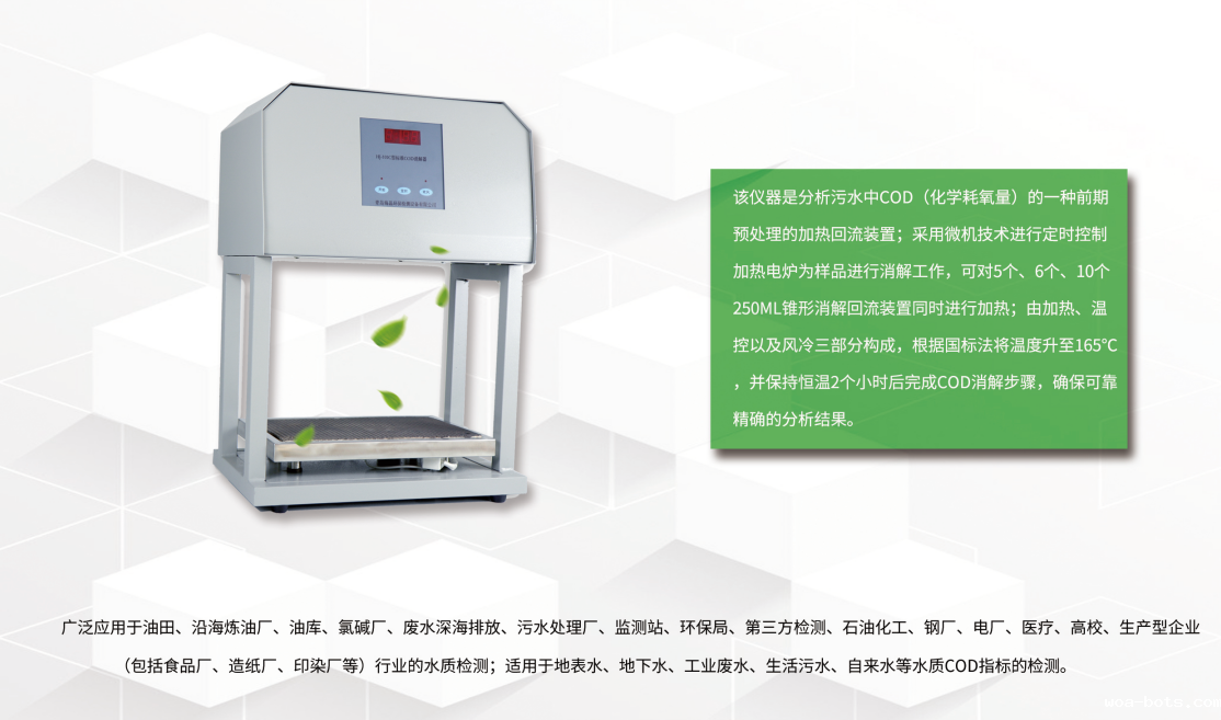 | 产品特点: | 适合日处理量不高的国家单位、第三方检测使用;由加热、温控以及风冷三部分构成,根据国标法将温度升至165℃,并保持恒温2个小时后完成COD消解步骤,确保可靠精确的分析结果。符合国际标准方法ISO06066-86和国家标准(GB11914-89)的要求...... |