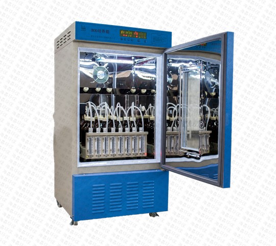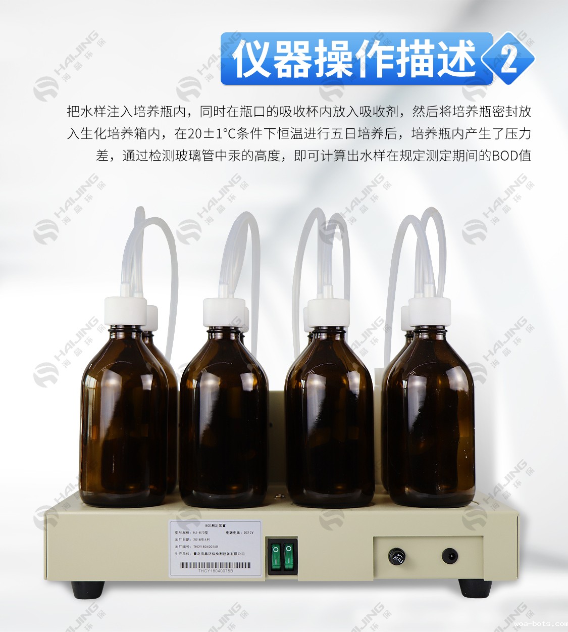 把水样或经过预处理水样注入培养瓶内,同时在瓶口的吸收杯内放入二氧化碳吸收剂(NaOH),然后将培养瓶密封,置于容积150L,内含电源插座的生化培养箱内,当被测样品在20±1℃条件下恒温进行五日培养后,在一定的搅拌速度下,瓶内的水样进行生物氧化反应。有机物转变成氮、碳和硫的氧化物,并产生二氧化碳气体被氢氧化钠吸收,而培养瓶内上部空间的氧气不断地供给水样中微生物的需氧量,培养瓶内产生了压力差,通过检测玻璃管中汞的高度, 即可计算出水样在规定测定期间内的BOD值。