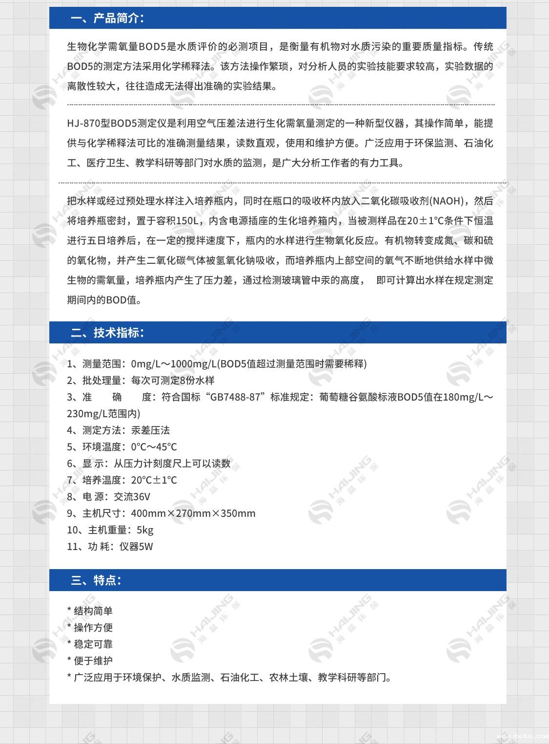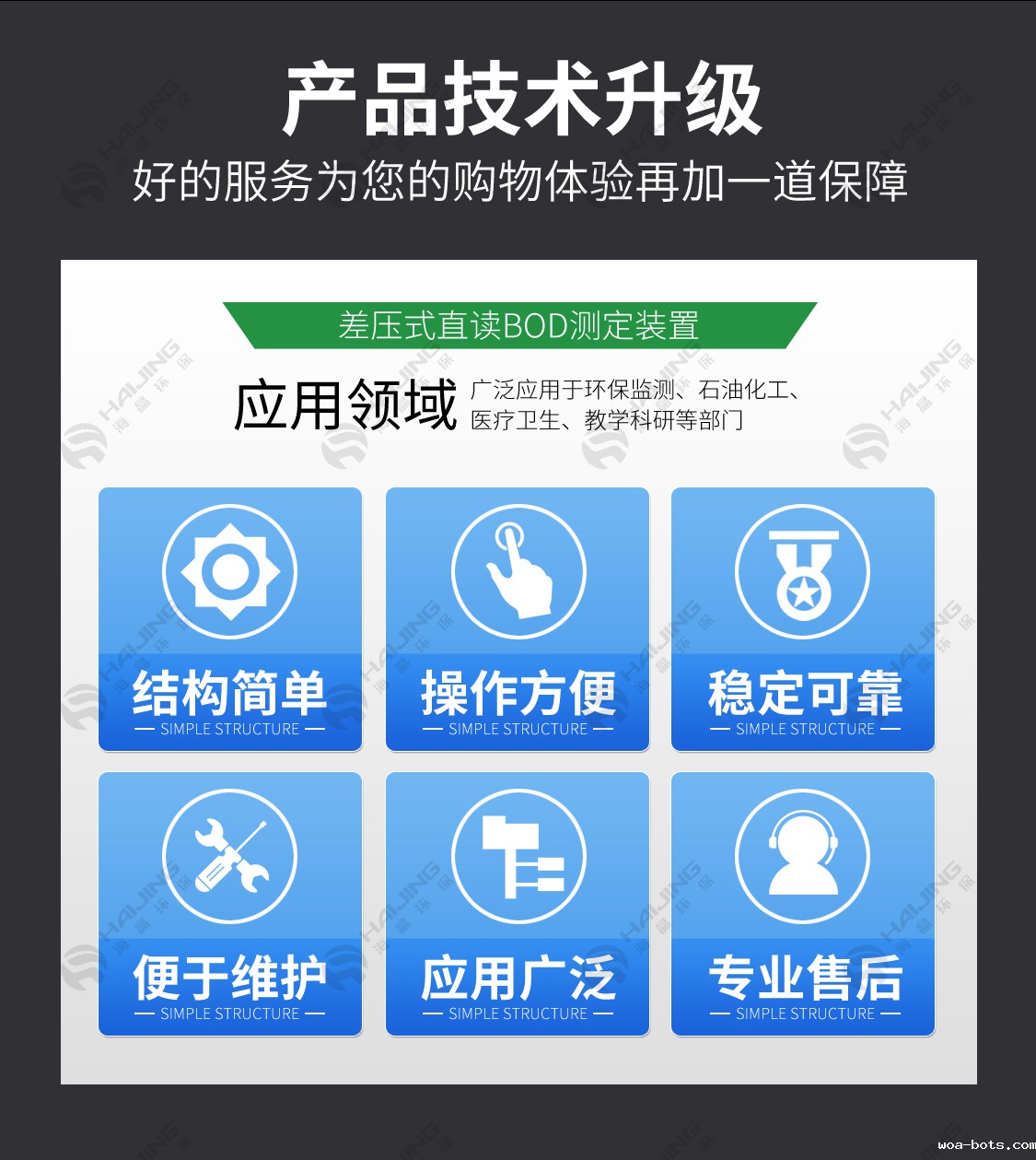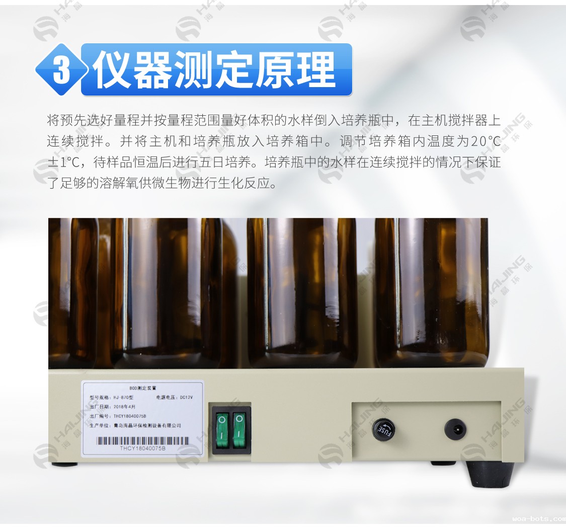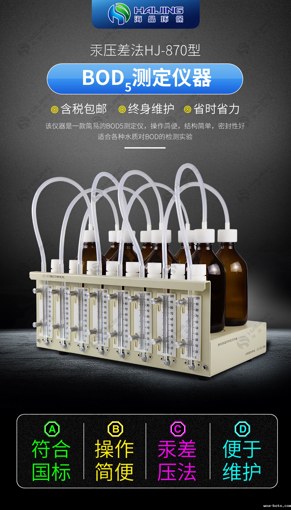 HJ-870型BOD5测定仪是利用空气压差法进行生化需氧量测定的一种新型仪器,其操作简单,能提供与化学稀释法可比的准确测量结果,读数直观,使用和维护方便。广泛应用于环保监测、石油化工、医疗卫生、教学科研等部门对水质的监测,是广大分析工作者的有力工具。