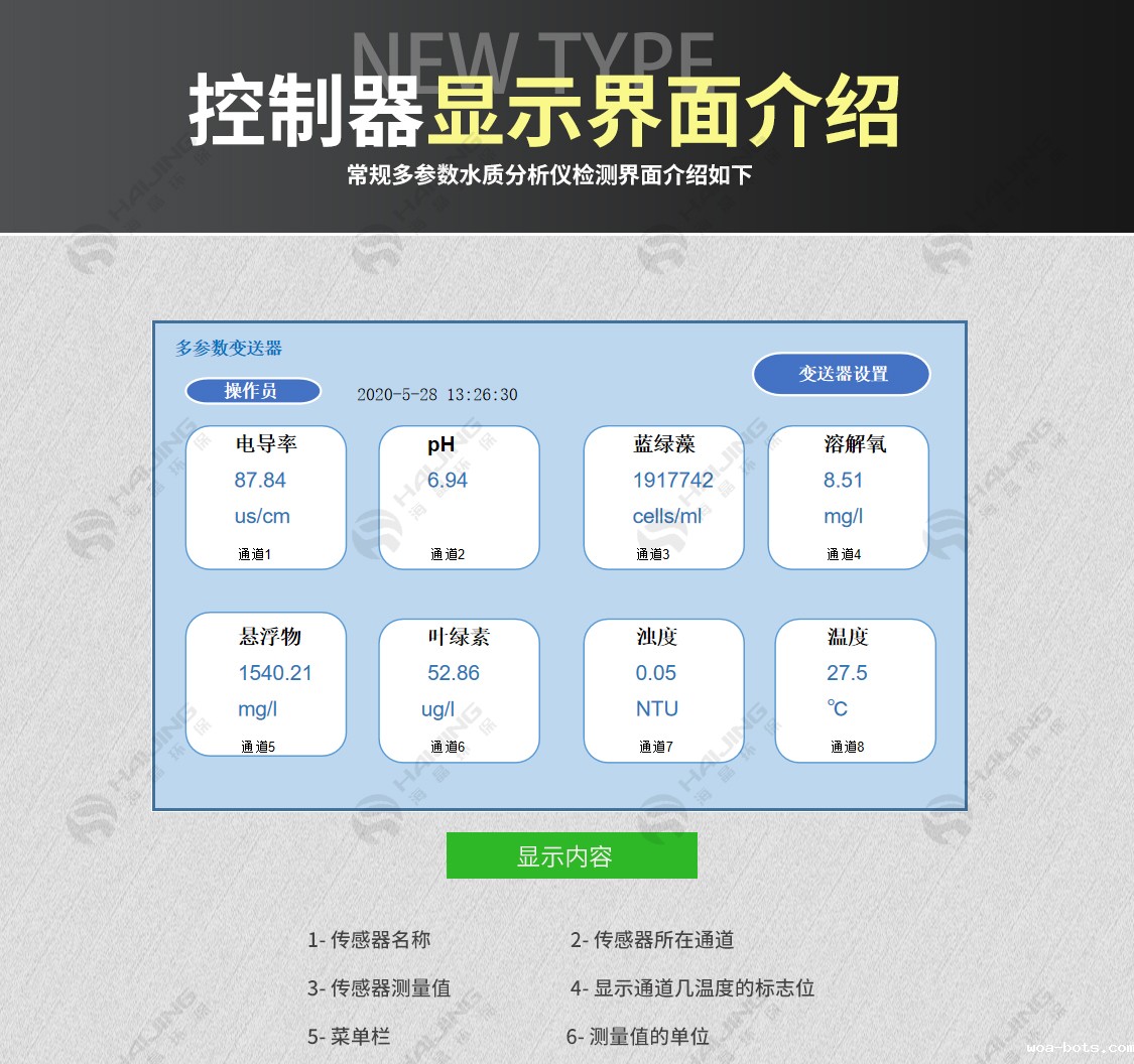 HJ-0205型多参数app华体会在线登录 可以根据客户不同需求,通过选配传感器实现同时在线监测多个多种不同参数值,包括温度、PH、电导、溶氧、浊度、污泥浓度、叶绿素、蓝绿藻等(参数可选配)。普遍应用于污水处理厂各工艺过程、自来水厂、地表水、饮用水源地、各种工业生产过程用水和废水处理过程、水产养殖等行业的水质在线监测。